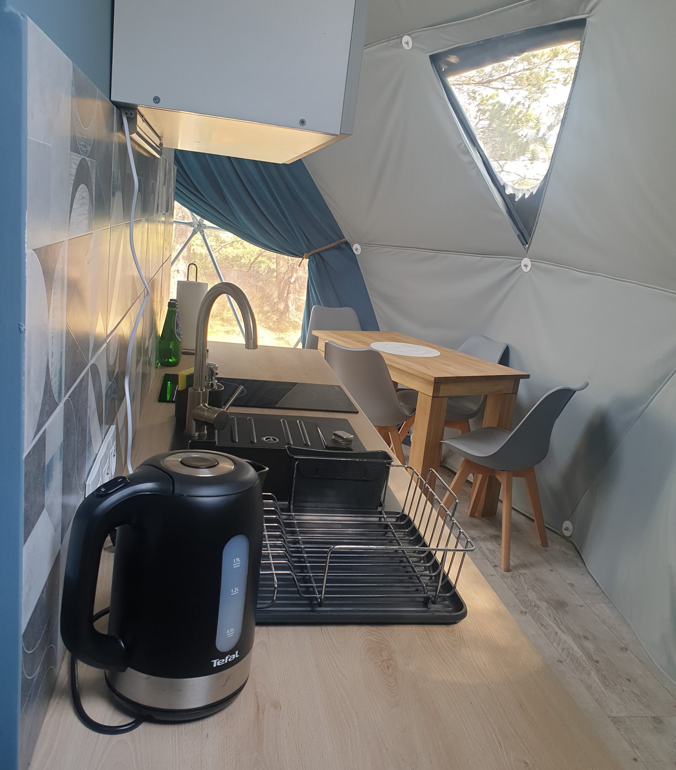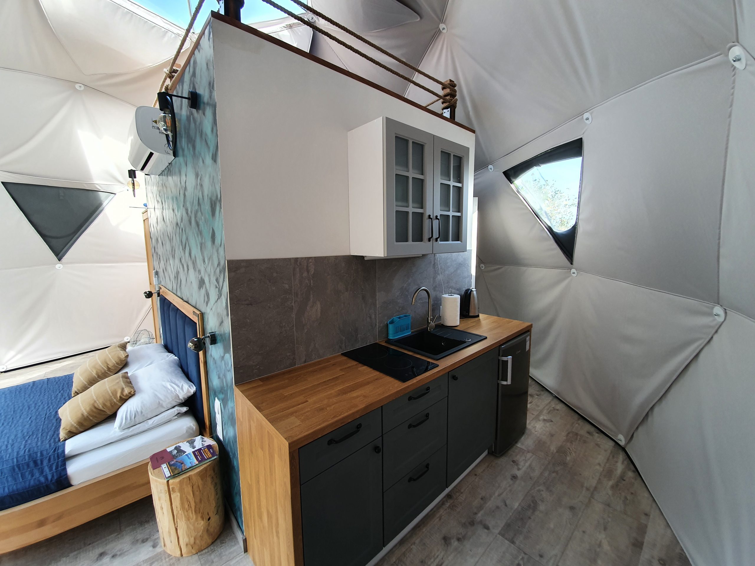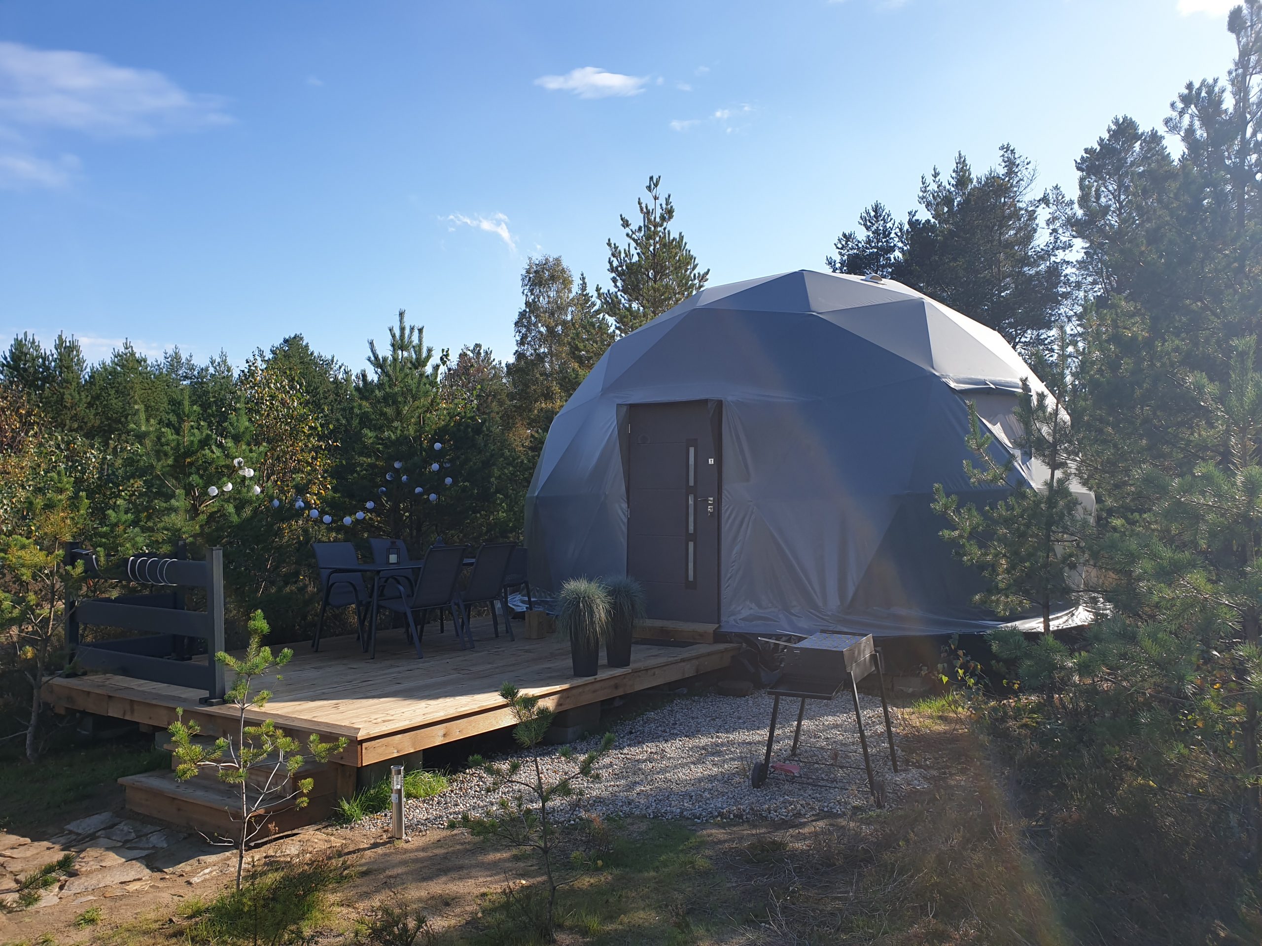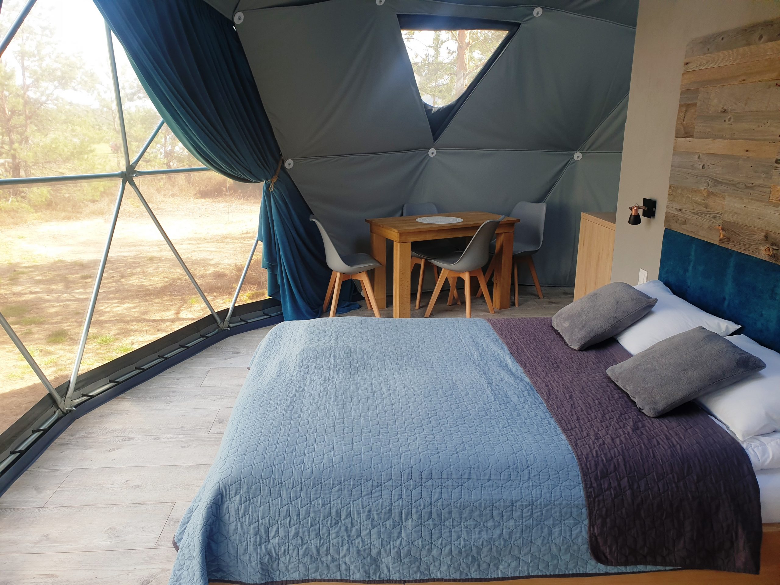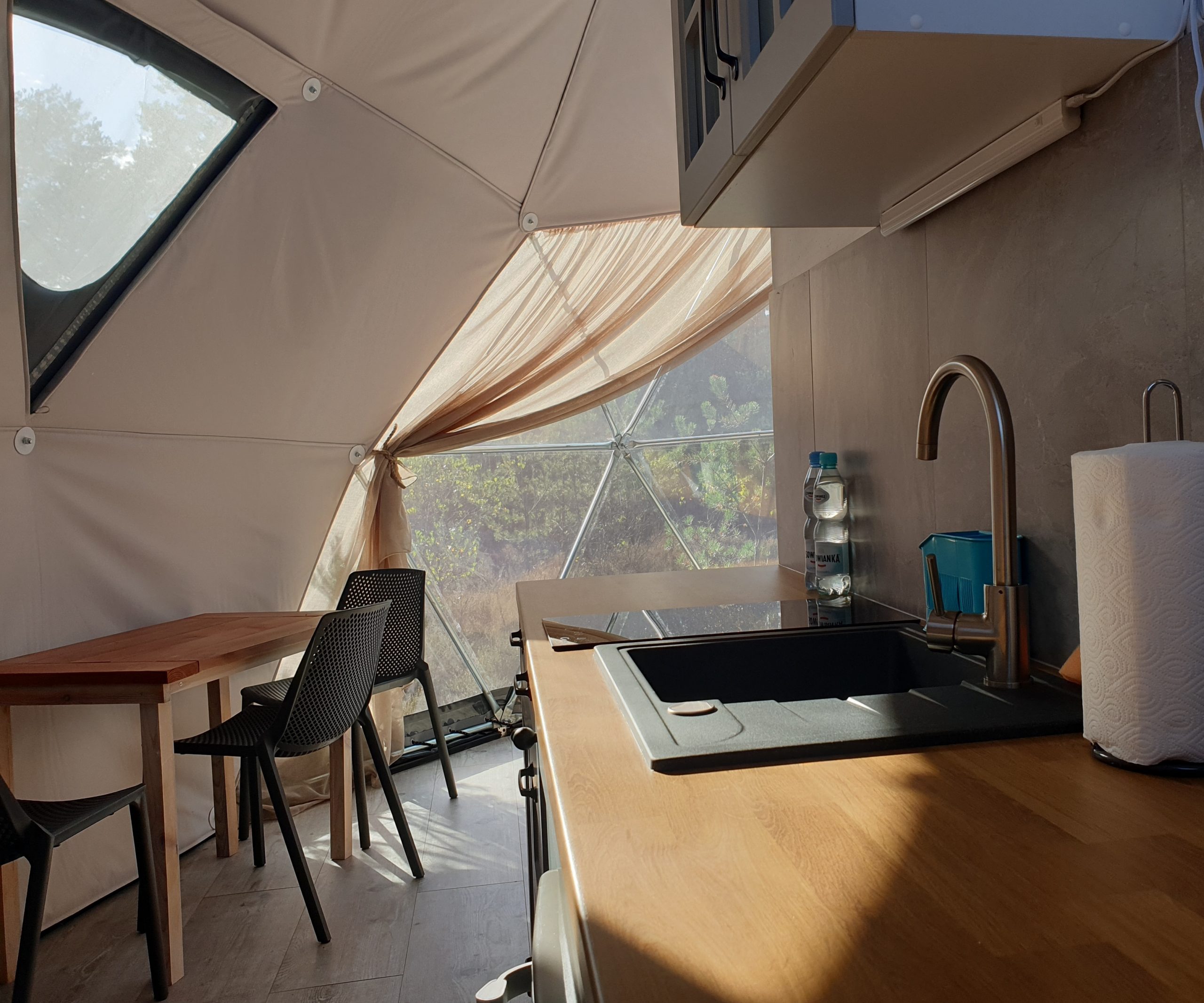 Dwa nasze namioty nie posiadają wprawdzie prywatnej sauny ani balii, są za to najpiękniej położone, w głębii ośrodka, wśród wysokich drzew. Dodatkowym ich atutem jest ogrzewanie podłogowe sypialni oraz łazienki.